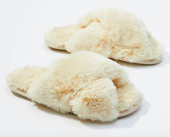 1. Faux Fur Slide Slippers || 2. Plaid Zip Pocket Shift Skirt || 3. Reversible Plaid Poncho Wrap || 4. Pearlized Beret
